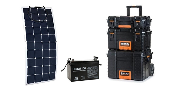 This mobile solar generator is based on a a Ridgid 3 piece modular rolling tool box that allows for easy mobility up to a 60lb battery, solar inverter, charge controller and various tools. This system is modular to gain access to the battery compartment in the base, and the other two modules for the inverter and charge controller. Battery module can be detached and moved separately from other two modules. Since the battery module is on it own and mobile, you can connect more together to give you more Amp Hrs of battery capacity.